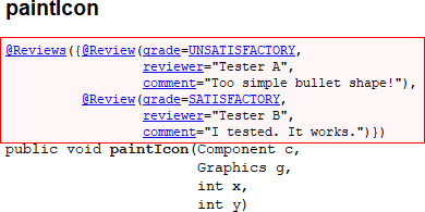 - As a grid (table), if the output format is HTML and this is a multi-line annotation to be put in a separate paragraph (in case of module/package/class/member header), so as to avoid its distortion when the annotation type name is extended automatically with the external link icon using CSS.