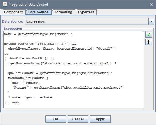 This template generates the name of a Java class and the hyperlink from it to the class documentation (click to see in full size): Here is how the class name is produced. The most of code works to determine if the class name should be qualified or simple one. The name will be qualified, when all is true:-