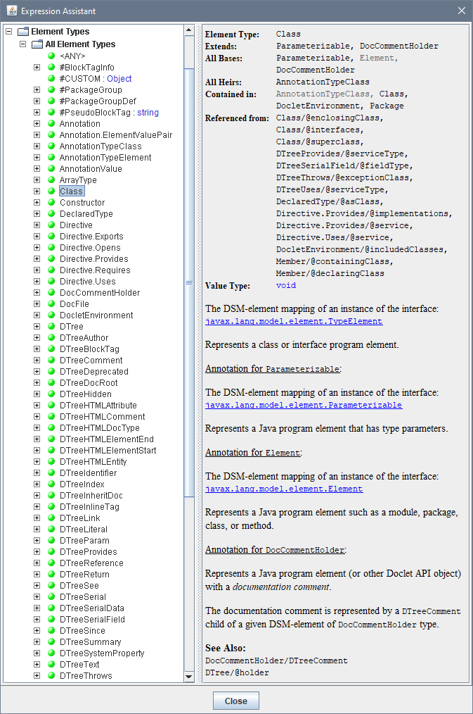 As a result, the entire Doclet API is mapped onto some XML-like representation called Doclet Data Source Model (or Doclet DSM). The elements and attributes, on which everything is mapped, are called DSM elements and DSM attributes.