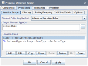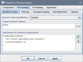 - Template components, which are functional programming elements that both generate single pieces of output and can be visualized graphically in a form resembling the output they generate. Template components are assigned with various properties that control their interpretation as well as specify the formatting of the output they produce. Some of such properties are static. Others are calculated dynamically by small scripts (with Java-like syntax) called FlexQuery-expressions, which provide access to lots of specialized functions, template parameters and properties of Generator Object Model.