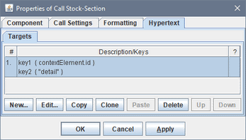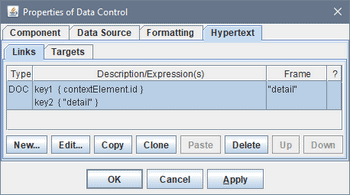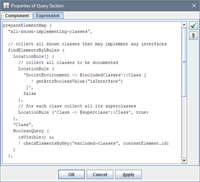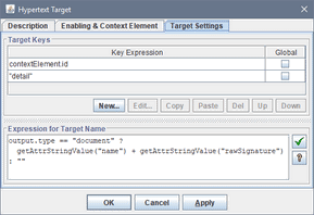 The incoming hyperlinks from external pages into the generated documentation can be supported as well. Each hypertext target (anchor) is generated by a definition like shown below (left screenshot below). It is specified in the properties of the component whose output is targeted. Typically, the anchor name is generated automatically and, therefore, meaningless. But it can be any predefined string generated by an expression specified in the properties of the target definition (right screenshot below), which can be used in the URL of the incoming link.