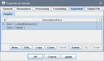 The additional settings, such as template parameters and output format options can be assigned in the special property inspector dialogs invoked by clicking the buttons on the right (click to enlarge):