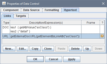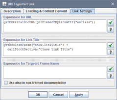 Similar to cross-links can be programmed the generation of outgoing hyperlinks to any external URLs. The link URL is produced by an expression specified in the properties of the link definition.On the following screenshots you can see how the generation of class name hyperlink is specified. The first “DOC” definition (left screenshot) is for the cross-link to the local class detail in the generated documentation. If such an internal destination does not exist, the external hyperlink is generated (according to -link option). That is the second “URL” definition (selected). On the right screenshot you can see its properties. The external URL is produced by a FlexQuery-expressions specified in «Expression for URL» field.