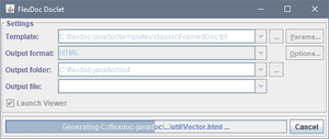 When no -nodialog option has been specified on the command line, as soon as Javadoc finishes parsing Java sources and calls the doclet to generate the output, the FlexDoc Doclet invokes the following Generator Dialog (click to enlarge):