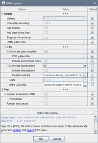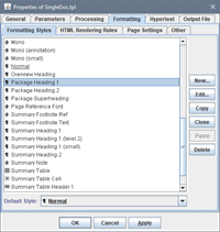 - Formatting styles, which are named bundles of formatting properties that as a whole can be assigned to a template component. They can be used to unify output formatting across all template set, as implicit parameters (by overriding in the calls of subtemplates) and to program the generation of named CSS rules (which allows styling the result documentation with custom CSS stylesheets).