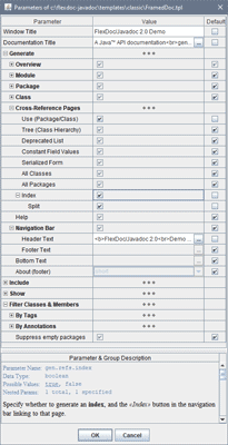 So, besides command line options, FlexDoc Doclet provides a more user-friendly way to control the template-based doclets interactively – the Doclet GUI.
