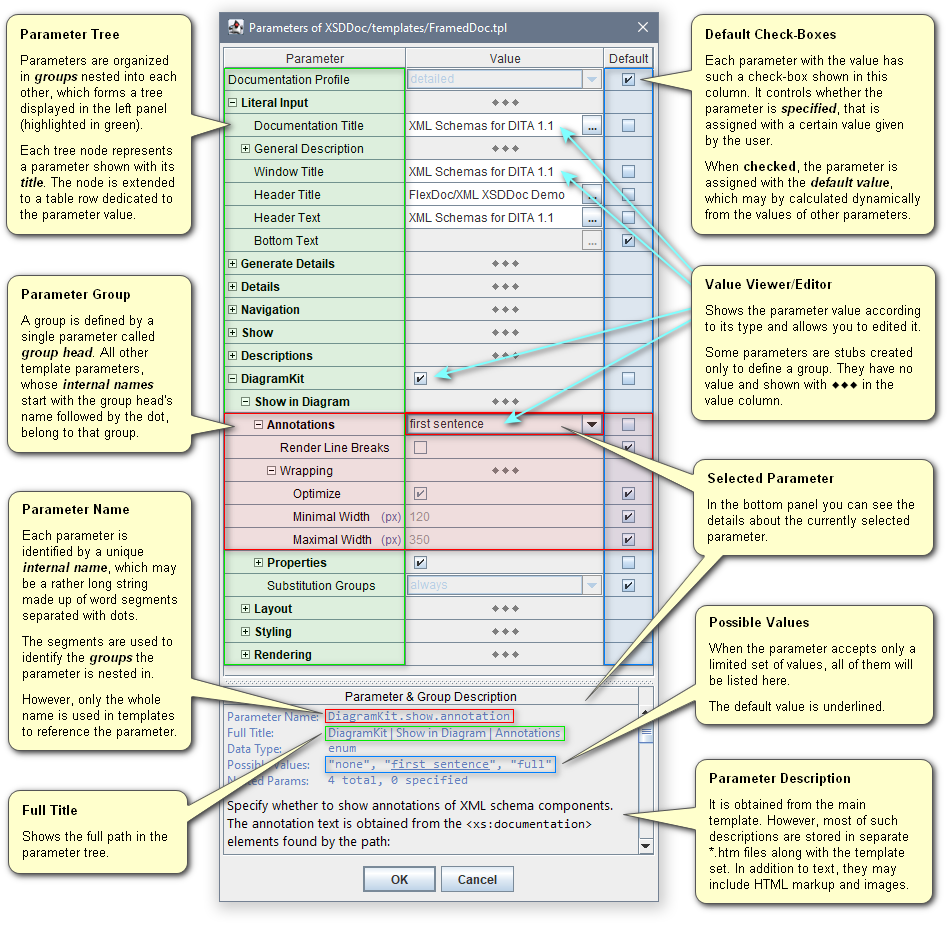 When in the Generator Dialog you choose the main template and click «Params» button, you will see the the Parameter Inspector as shown on the following commented screenshot: