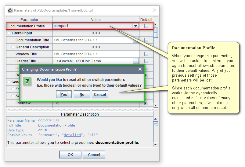 Large template sets may expose hundreds of parameters to allow you to customize the generated documentation within a great range of details. However, that requires you to browse the template parameter tree, understand what each parameter means, and specify some of them accordingly.To help you with that the main template may provide a special profile parameter, which allows you to change lots of other parameters at once so as to adjust everything to a certain predefined documentation structure that may be more suitable for your needs.