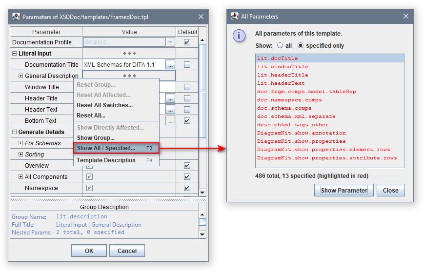 As the total number of parameters may exceed hundreds, you may want quickly to find which of those parameters are specified. That can be easily done. Just invoke the popup menu over the Parameter Inspector and select the «Show All / Specified...» item. Then, the list of all parameters defined in the template will appear in a separate dialog where, unlike the Parameter Inspector, they will be presented by their actual names (however, follow in the same order). Select the «specified only» radio-button. Then, only specified parameters will be filtered out and shown in red: