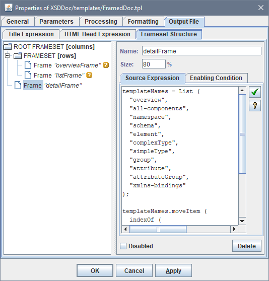 The expression specified in the «Source Expression» field (on the right panel) should return the pathname (or URL) of a document to be initially loaded in the given frame.