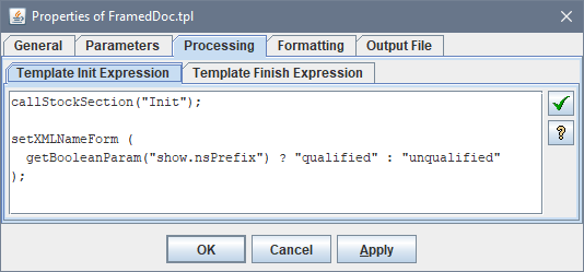 FramedDoc.tpl is a main template designed to generate multi-file (Javadoc-like) framed HTML documentation by any number of XML schema files.On left the you can see how this template looks when open in the Template Designer (click to enlarge). On the right is a sample documentation generated with it (click to view the HTML):