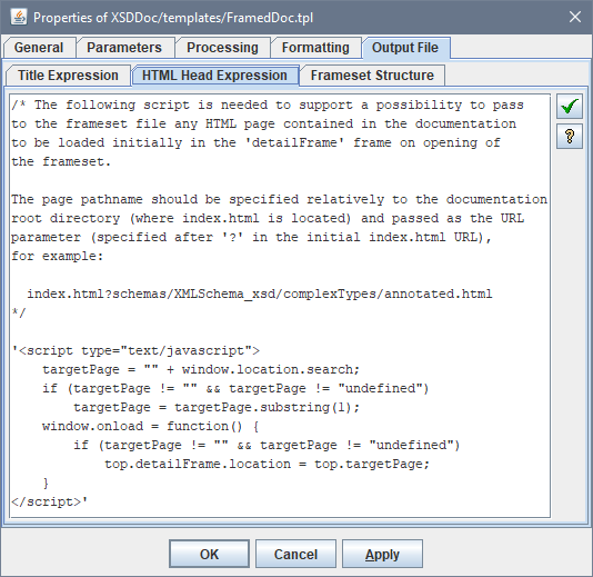 The frameset file is generated according to the definition specified in the «Output File | Frameset Structure» tab of the FramedDoc.tpl properties dialog: