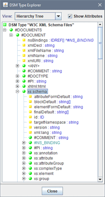 This screenshot shows a part of the tree representation of the element types and their attributes constructed by this XML Type definition (click on the picture to see a more expanded tree view):