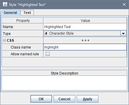 The class name (selector) assigned to a named CSS rule comes from the corresponding template formatting style, by which the rule is generated. The rule class name must be specified with the "CSS | Class name" property in the style definition: